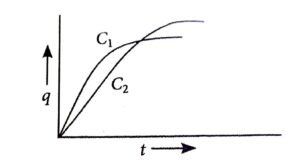 9. Two capacitors C₁ and C₂ are connected in parallel to a battery. Charge-time graph is shown below for the two capacitors. The energy stored with them are U₁ and U2, respectively. Which of the given statements is true?