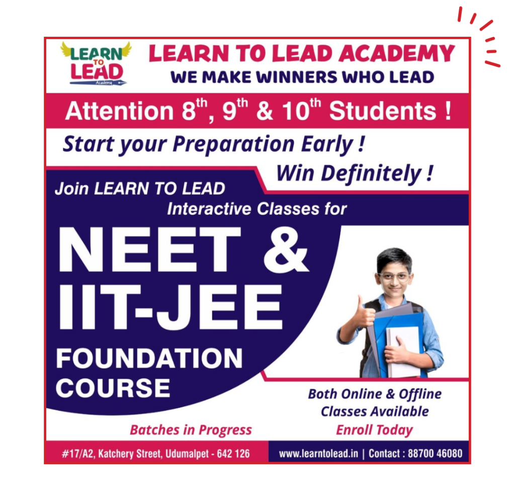 This program aims to give students a head start in their NEET preparation journey, ensuring they are well-prepared and confident as they progress through their higher secondary education. For more details and enrollment information, please contact LEARN TO LEAD Academy. – For Enquiry Contact: +91 8870046080