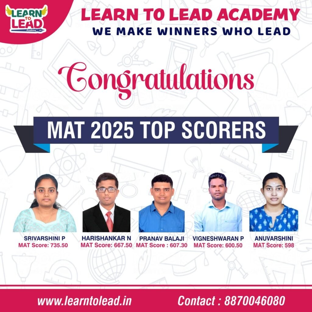 Embark on a journey to success with Learn to Lead Academy’s MBA/PGDM 2025! Elevate your MAT 2025 Feb/May/September/December preparation through our comprehensive test series and live classes. Join the league of achievers like MAT 2023 toppers: Sathvika (755.50), Kesavan (642.50), Jeevithan (640), and Maneesh Kumar (638). Take the next step towards success at Learn to Lead Academy, where we specialize in creating winners who lead! Boost your scores and unlock your potential with us.